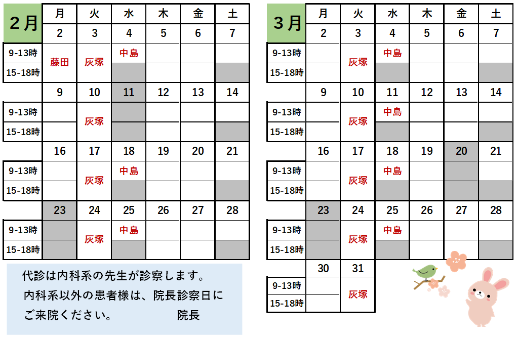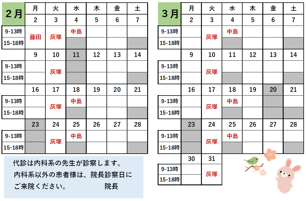 誠に申し訳ございませんが、2/12~3/26までの毎週(水)と2/17(月)が院長不在で代診になります。