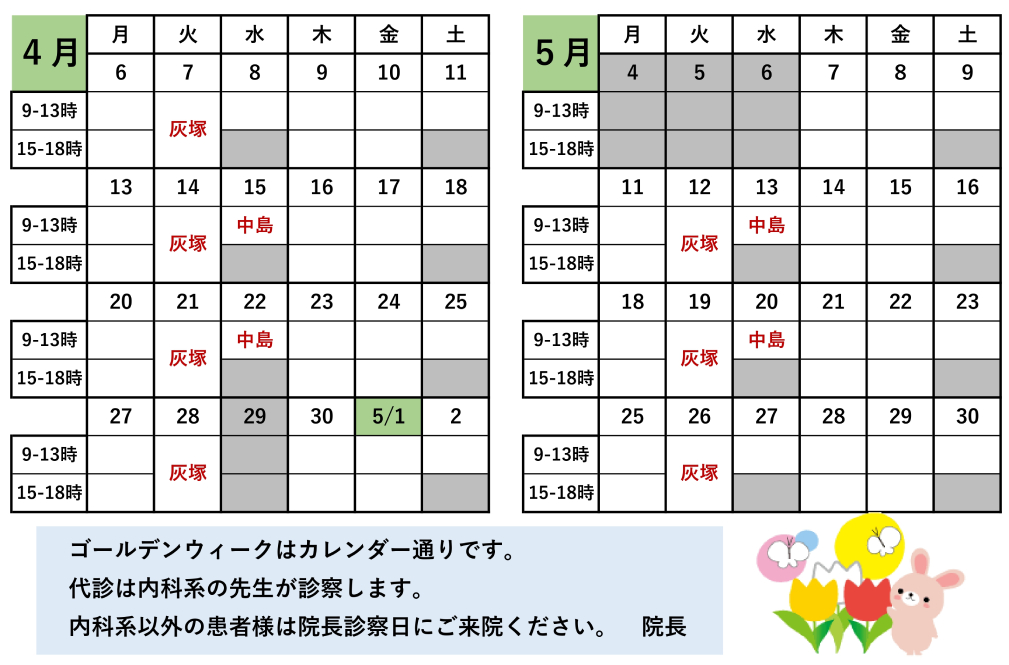 代診の先生は内科系の先生ですので、 内科系以外の患者様は院長診察日にご来院ください。