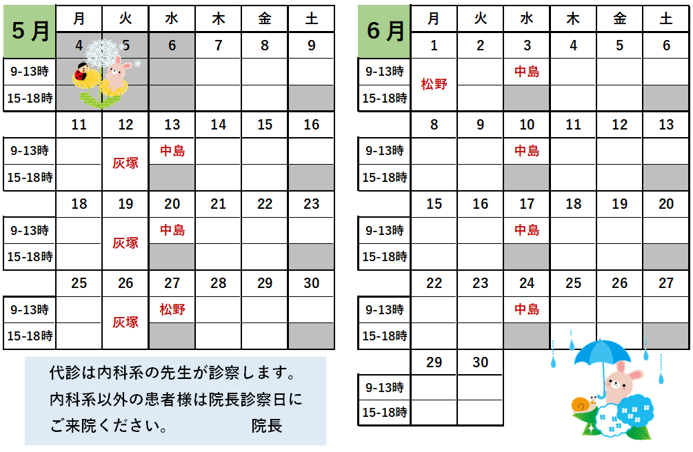 誠に申し訳ございませんが、下記日程は院長不在で代診になります。