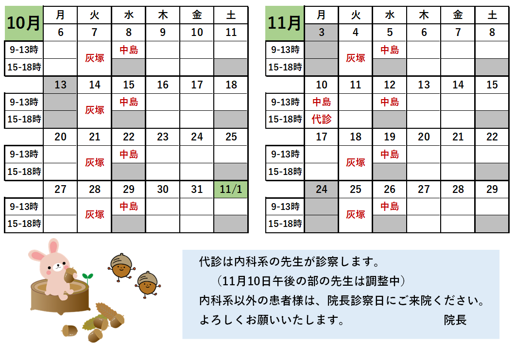但し、11月3週目に限り11/11(月)が代診の先生で11/12(火)が院長の診察となりますのでご了承ください。